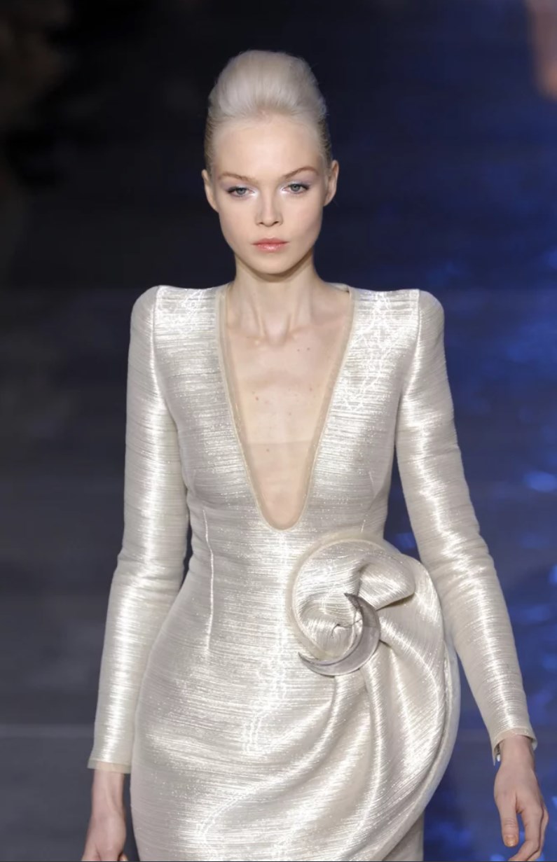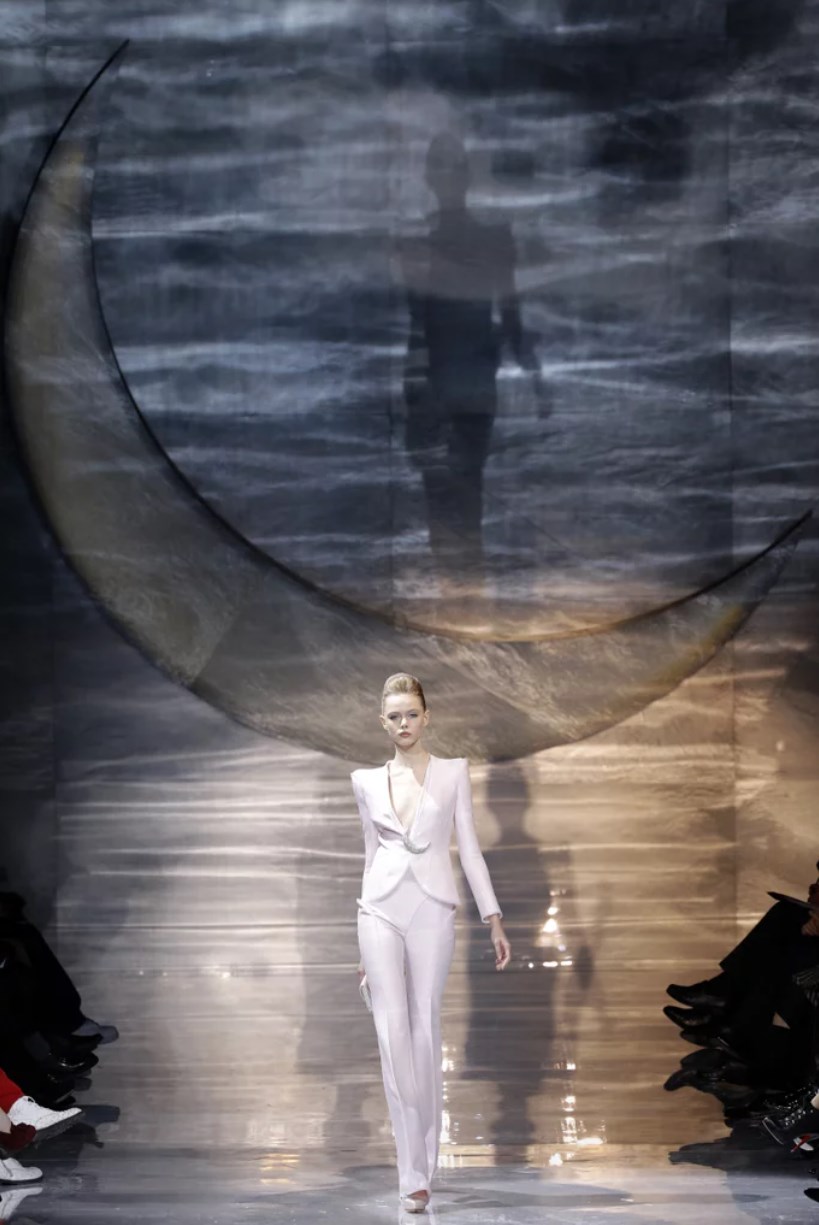 Armani Privé 2010SS COUTURE系列參考月球的外觀質感, 運用發光織物、曲線剪裁、看起來像月球隕石坑的刺繡,以及新月形的金屬裝飾等元素帶來歷久彌新的造型設計 #傳遞知識的副料大學