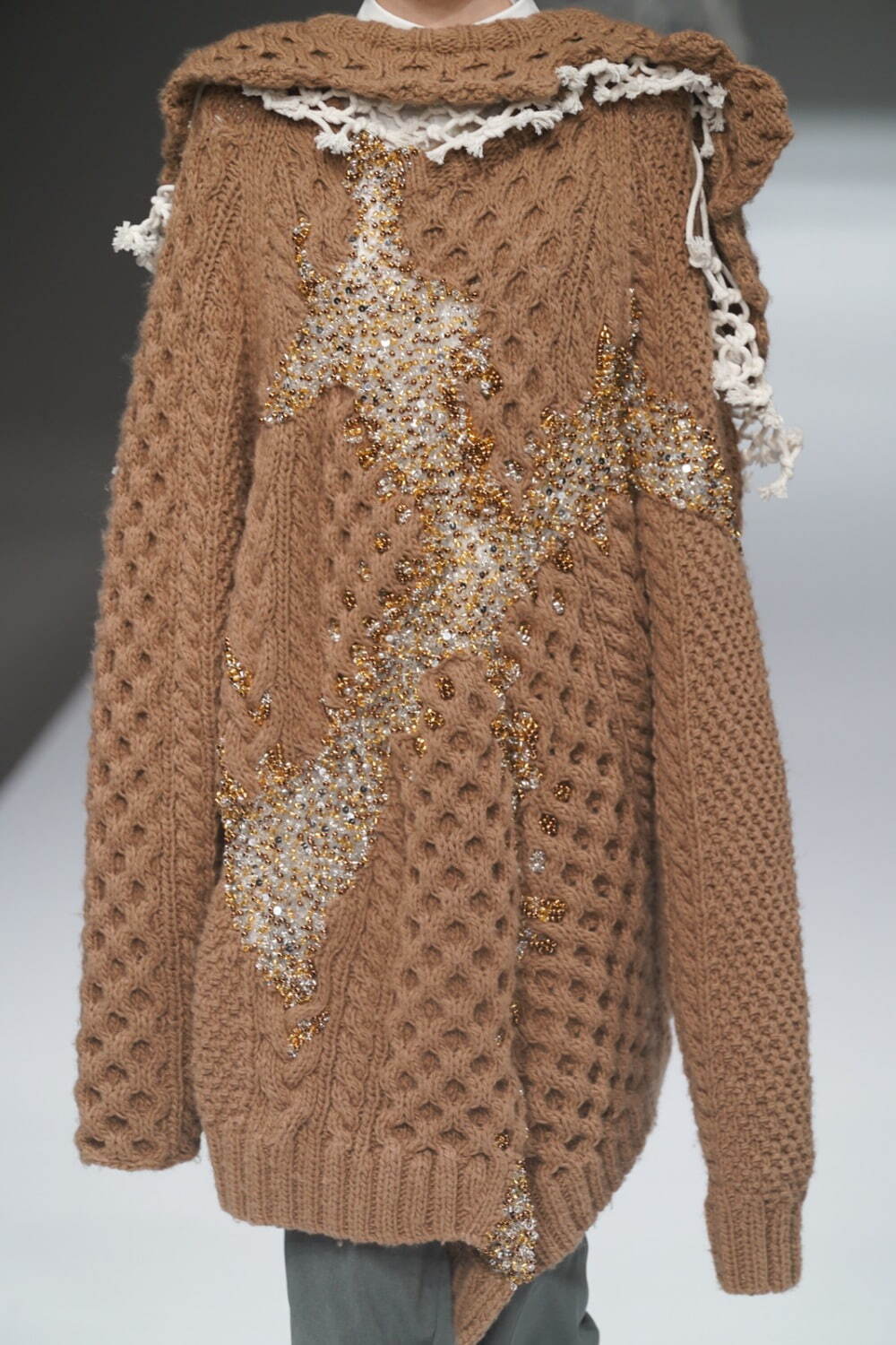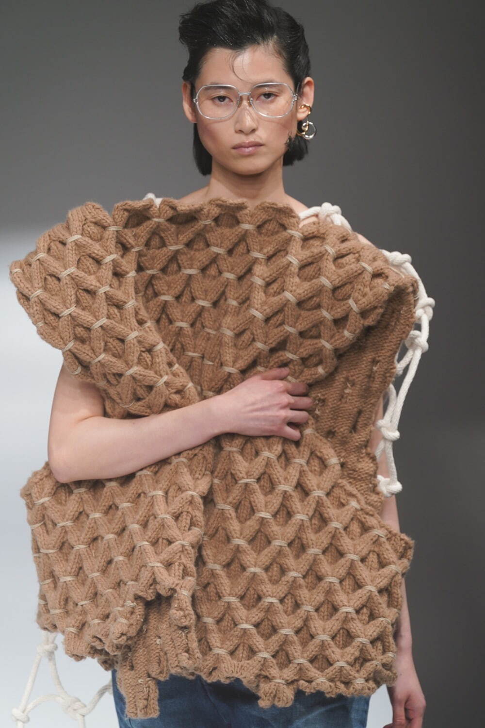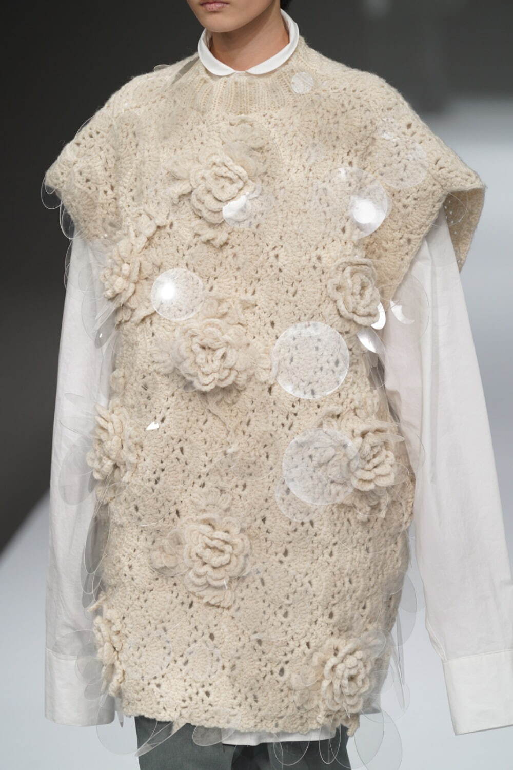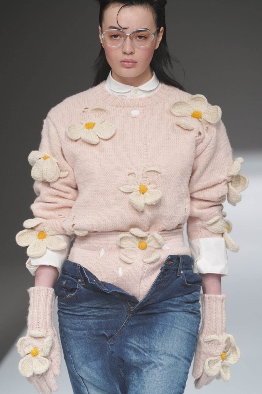 Pillings 2022秋冬系列以“製作可愛的針織物”的方式,呈現出“理想與現實”的衝突與美好。設計師用他擅長的針織設計表現出在間隙中掙扎的人類形象和生活中的美感。 服裝上爬滿螞蟻象徵著有秩序的社會,各種昆蟲標本的編織為針織物增添了一種略帶詭異的氣氛。鬆垮的下身設計使得行走困難,隱喻著“難以生存的人”。 大廓型針織衫用粗繩交叉,動感的細節給人一種略顯粗獷的感覺,但由於它們美麗而均勻的分佈,呈現出精緻而精緻的氛圍。