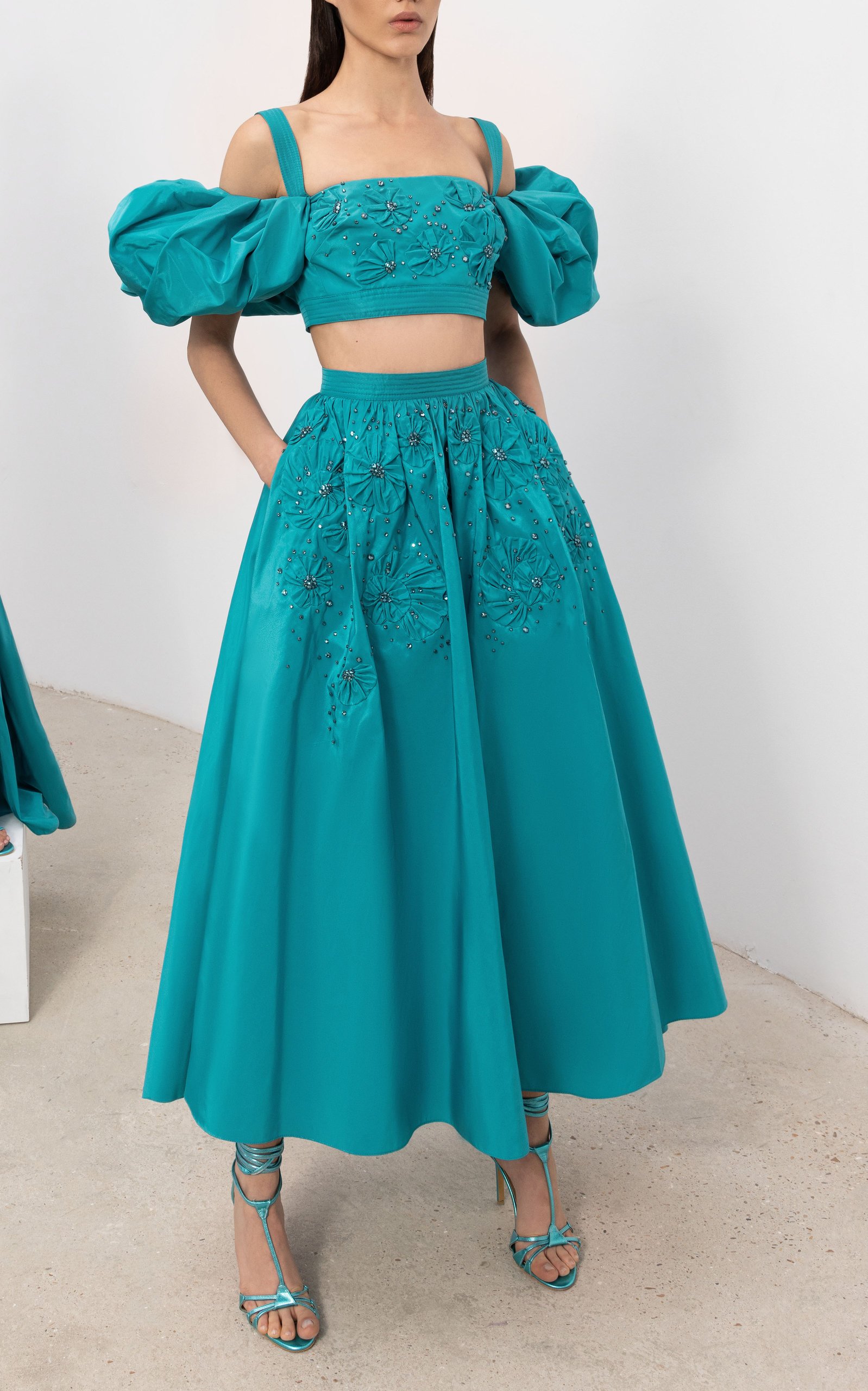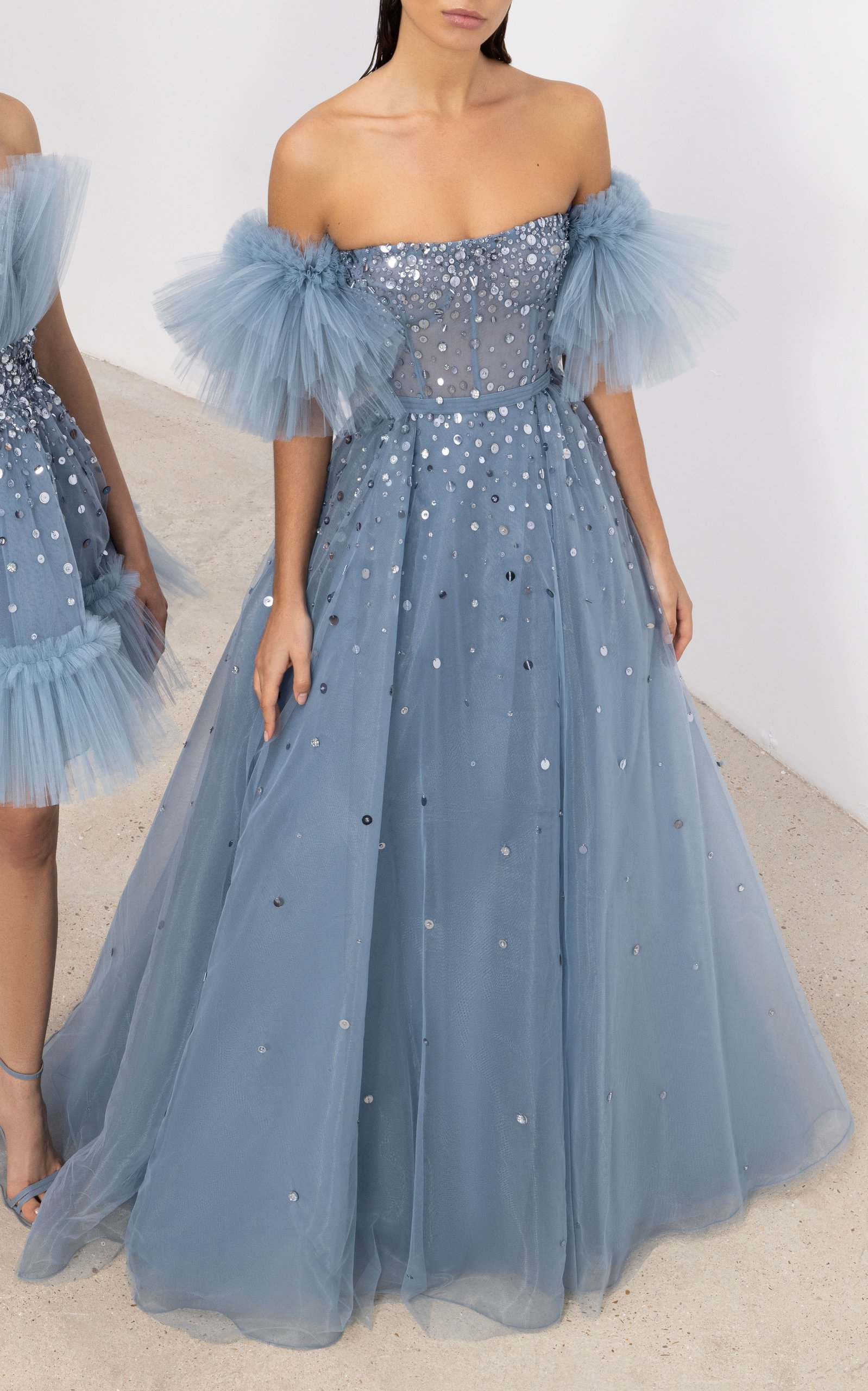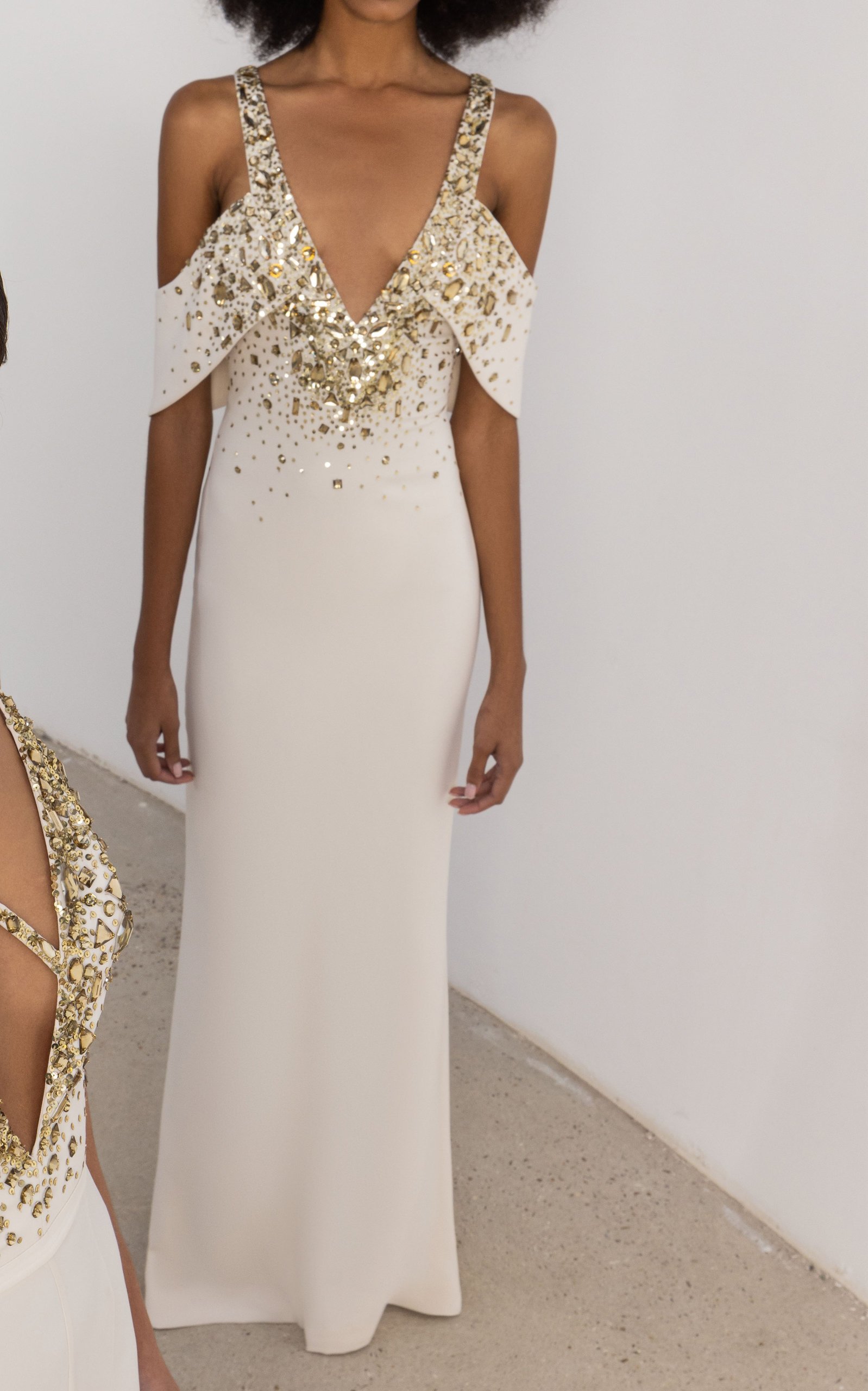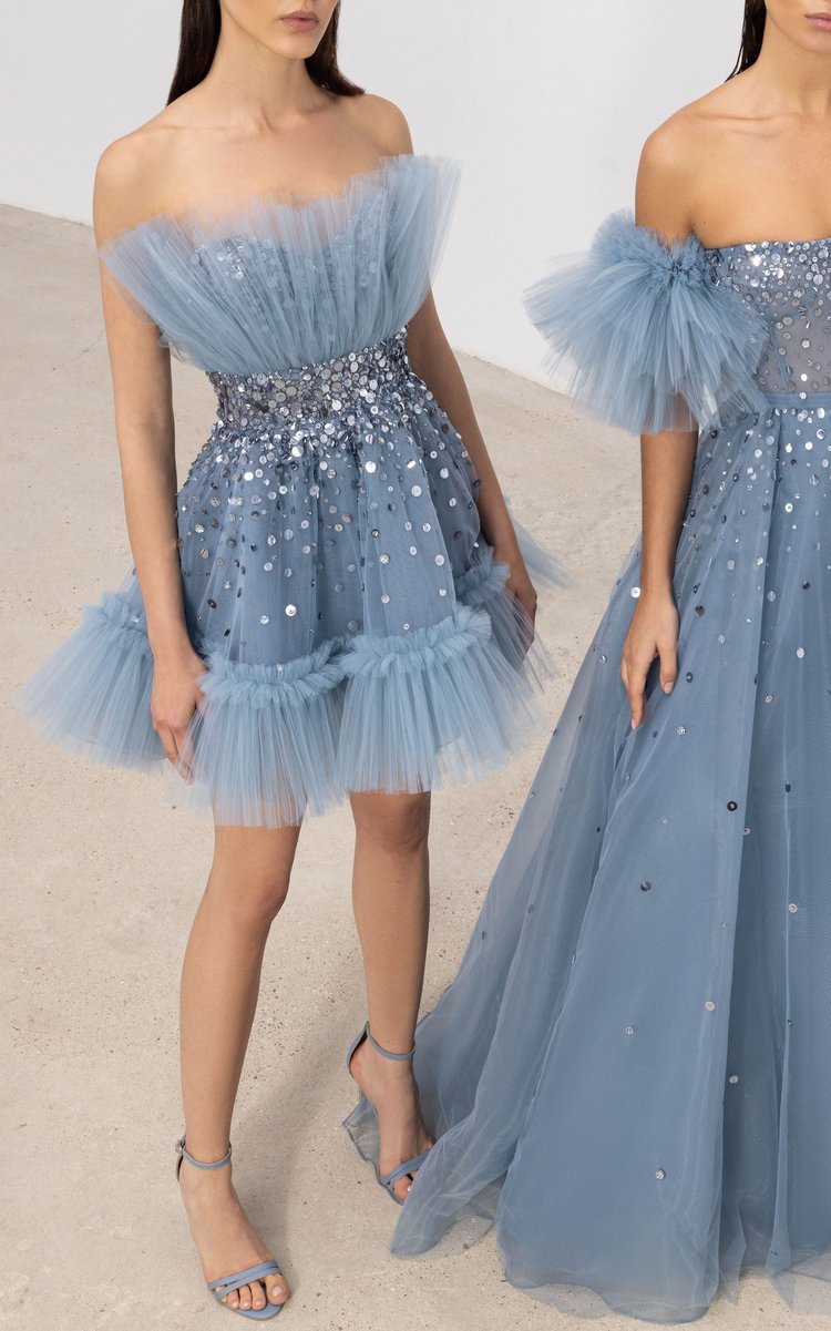 Zuhair Murad 2023 SS 運用大量水鑽、亮片、蕾絲打造女性柔美氣息。 鑽飾大面積鋪灑添增立體感、或作線條裝飾打造流線感,讓整體造型更為耀眼閃亮 #傳遞知識的副料大學