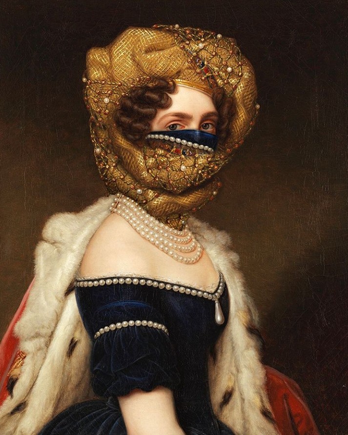 Volker Hermes "Hidden Portraits"系列 運用photoshop將歷史肖像畫照片做後製,用新奇浮誇的手法疊加出服裝的層次,彷彿戴上口罩一般,將臉部遮蓋並隱藏在面料之下。 instagram@volker.hermes