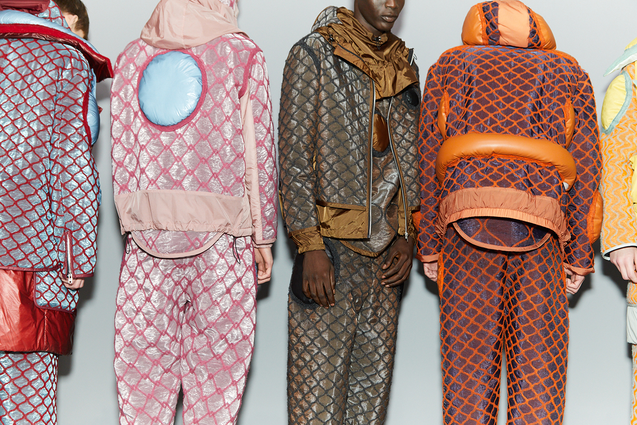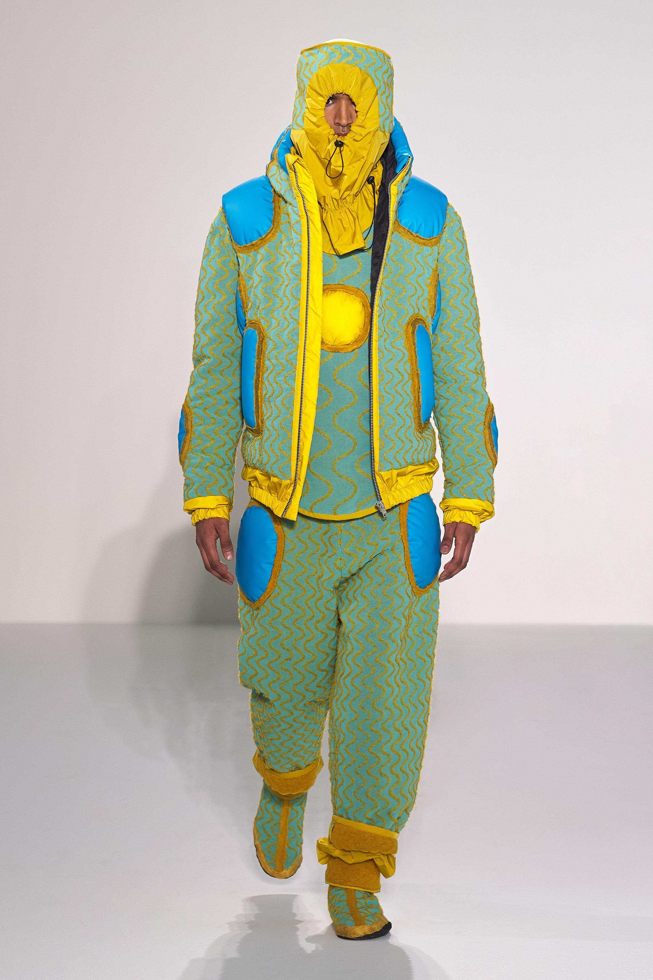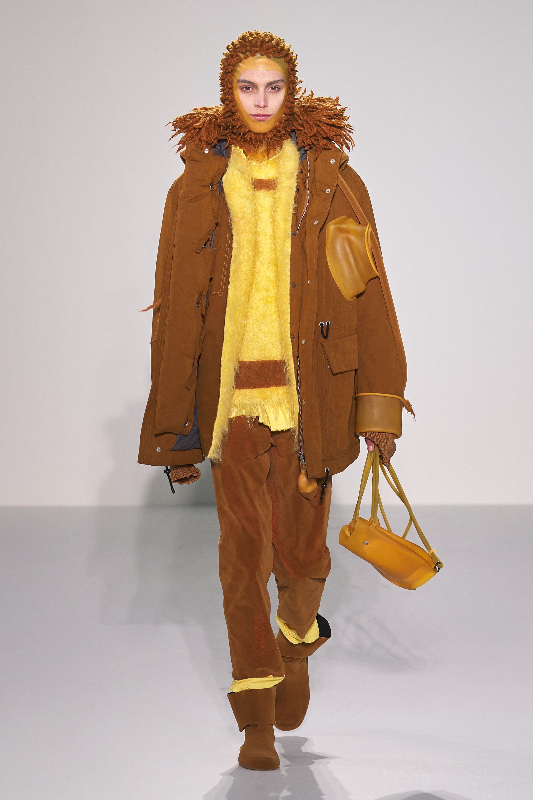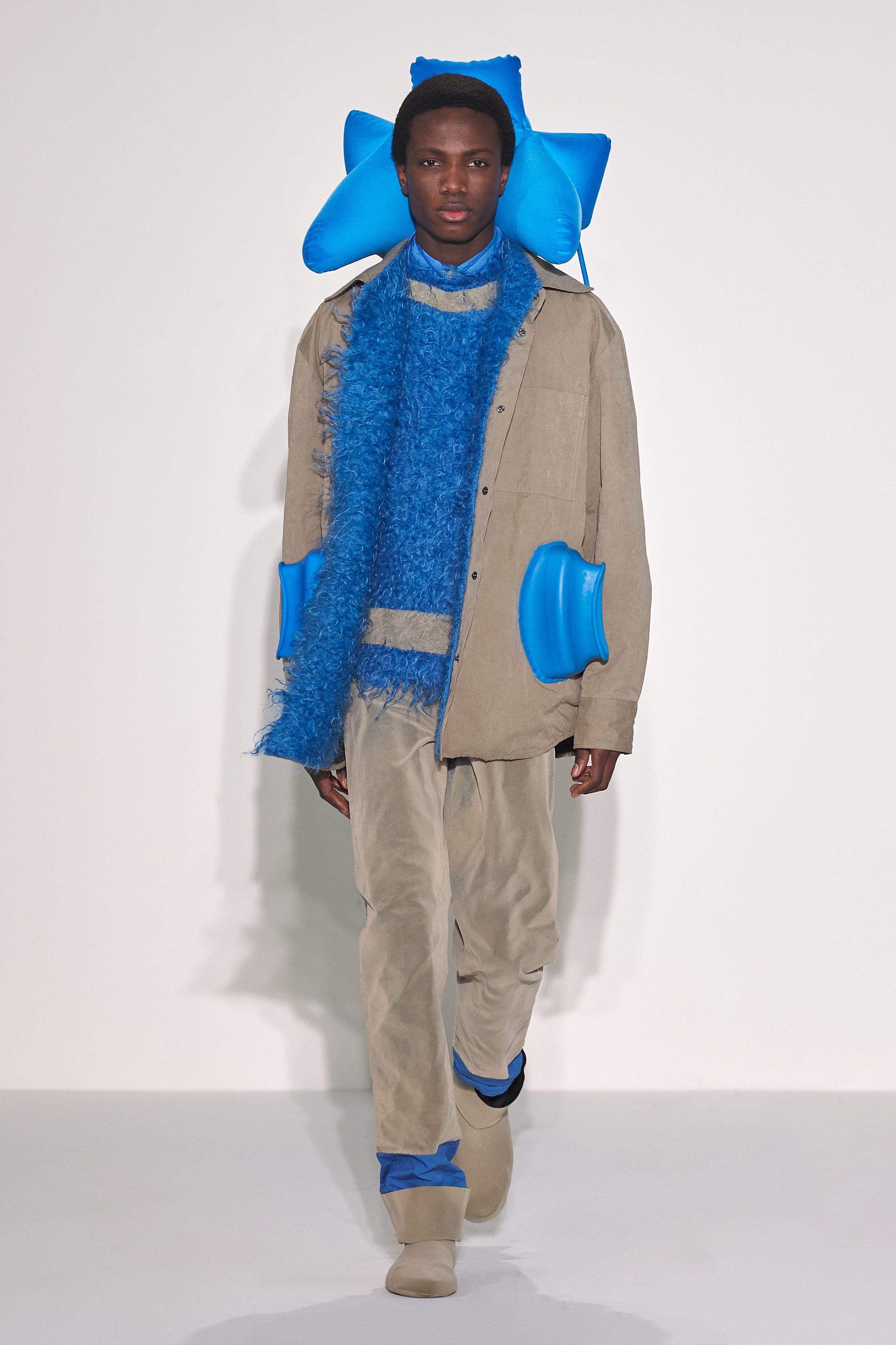 Craig Green 2022 秋冬系列探究了Craig對這些詞彙的含義:身體、封鎖的幽閉恐懼症,以及服裝中表現出來的內在感覺和外表間奇怪的心理摩擦。 憑藉著系列中的造型獨特的充氣服飾、毛海材質等多種紋理的運用,功能性設計和配飾的呈現都讓人沉浸其中。