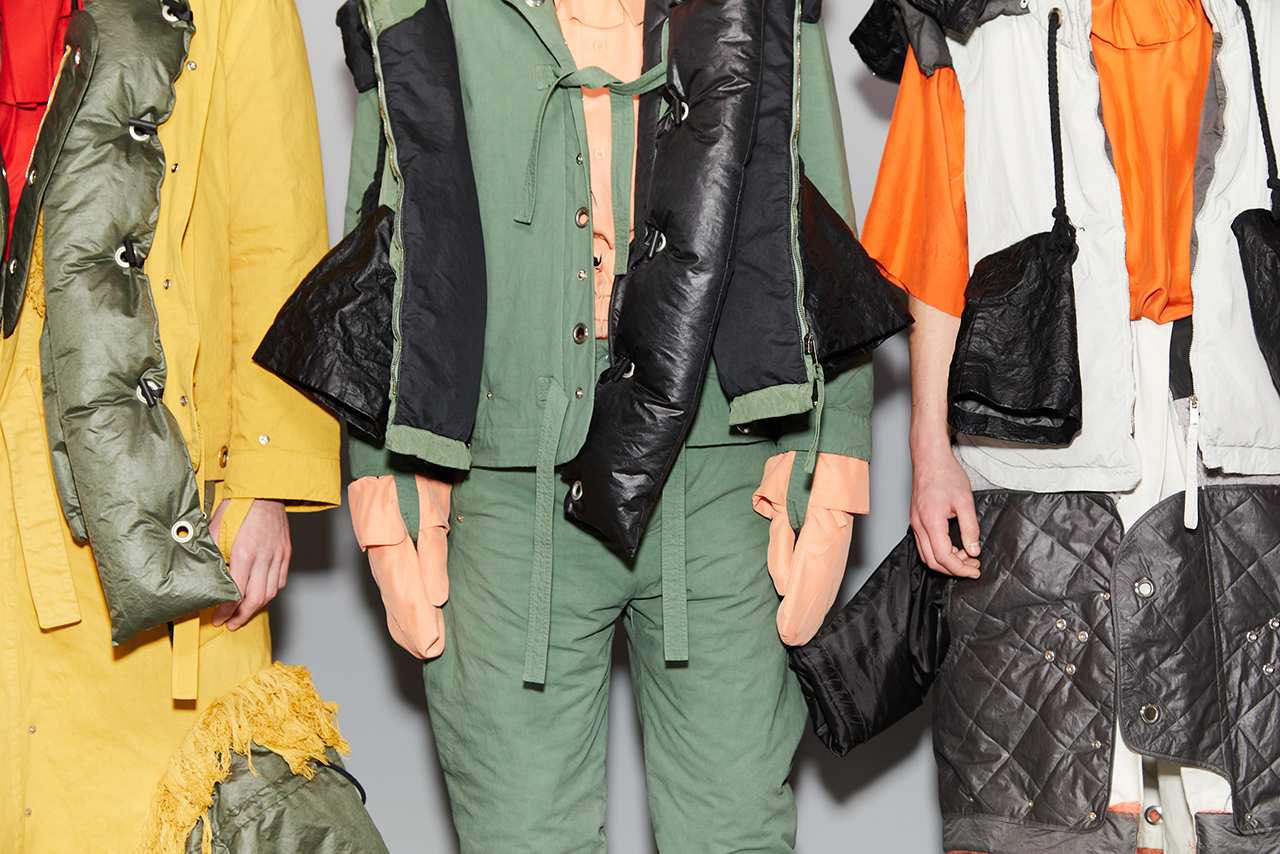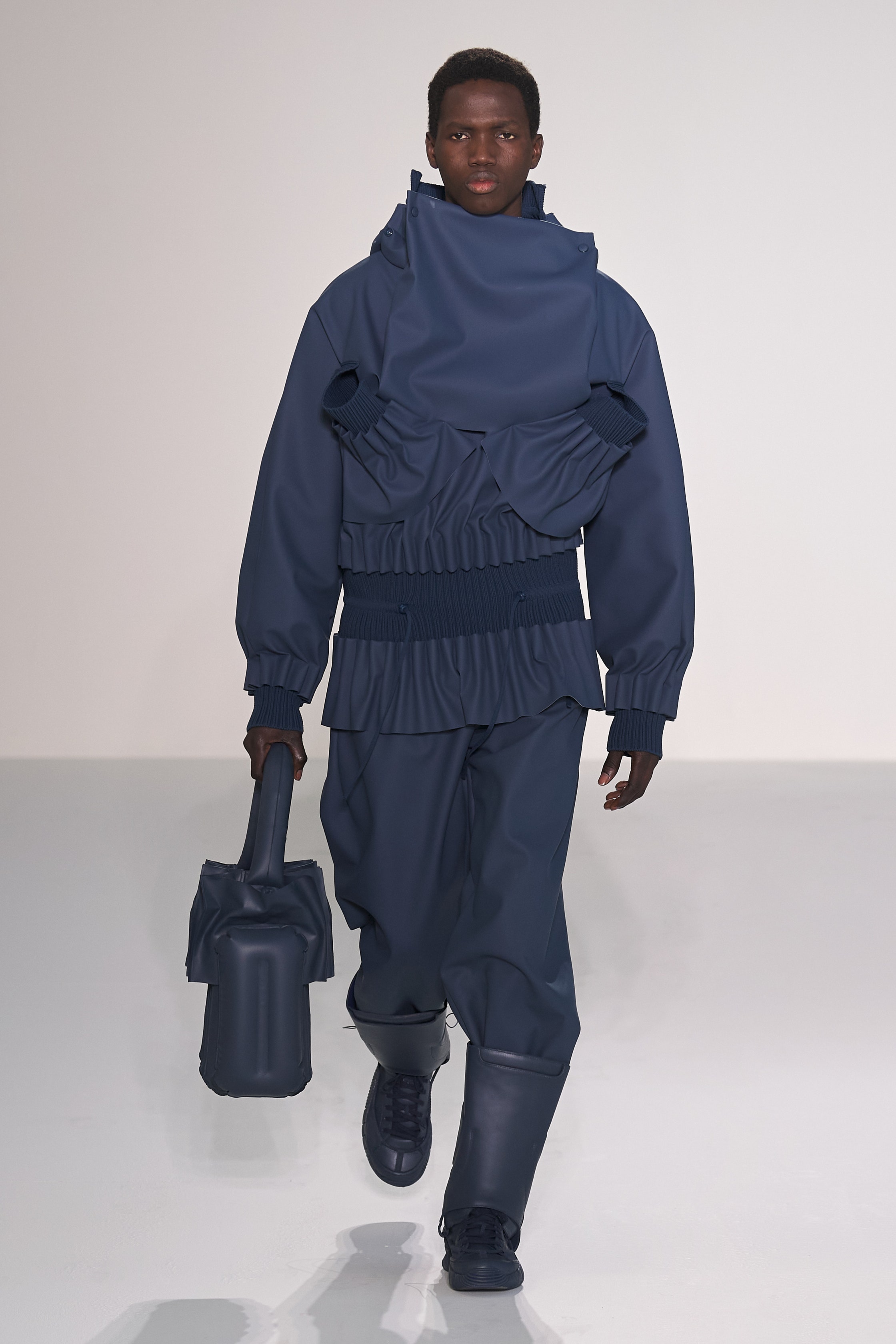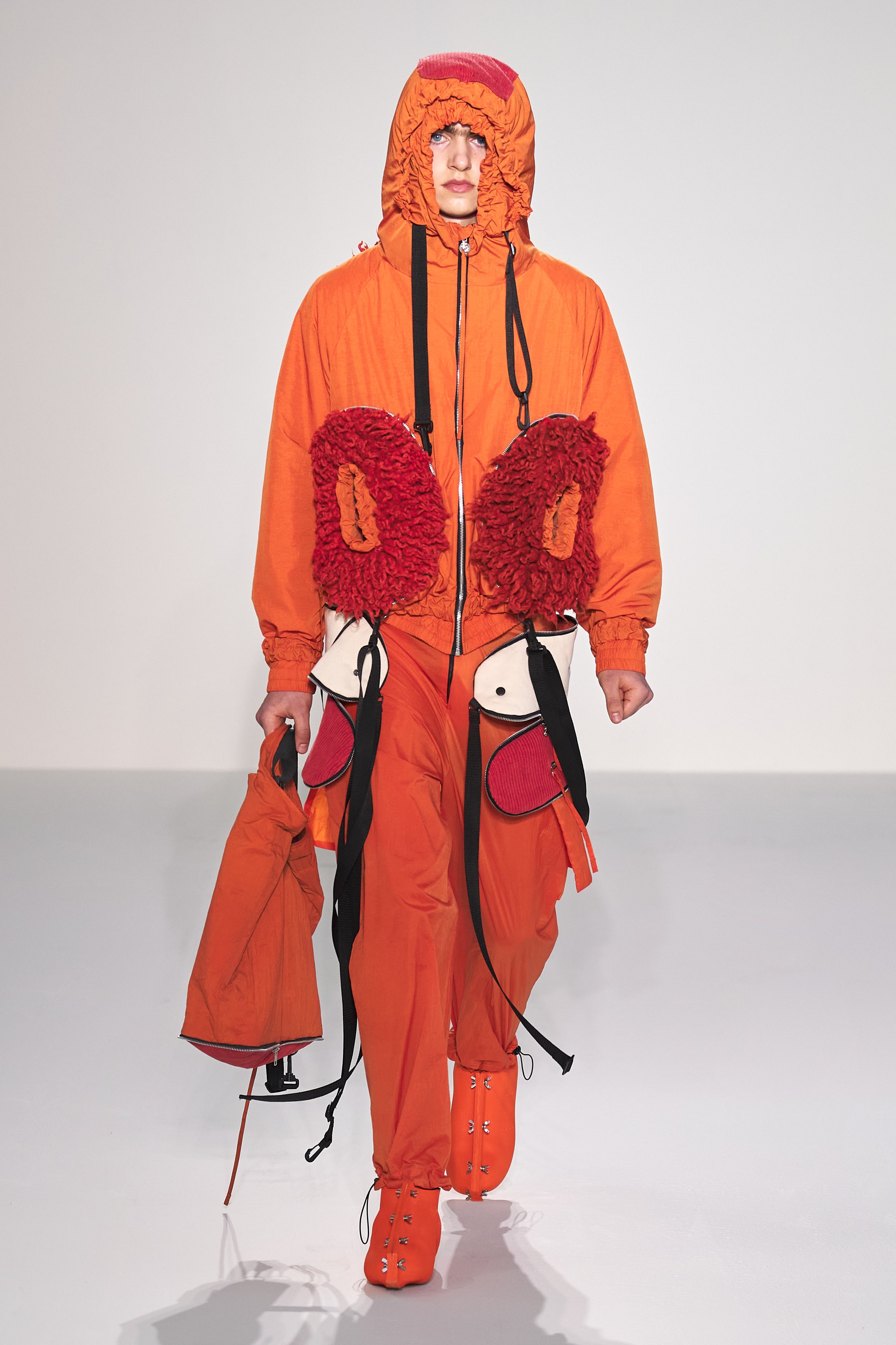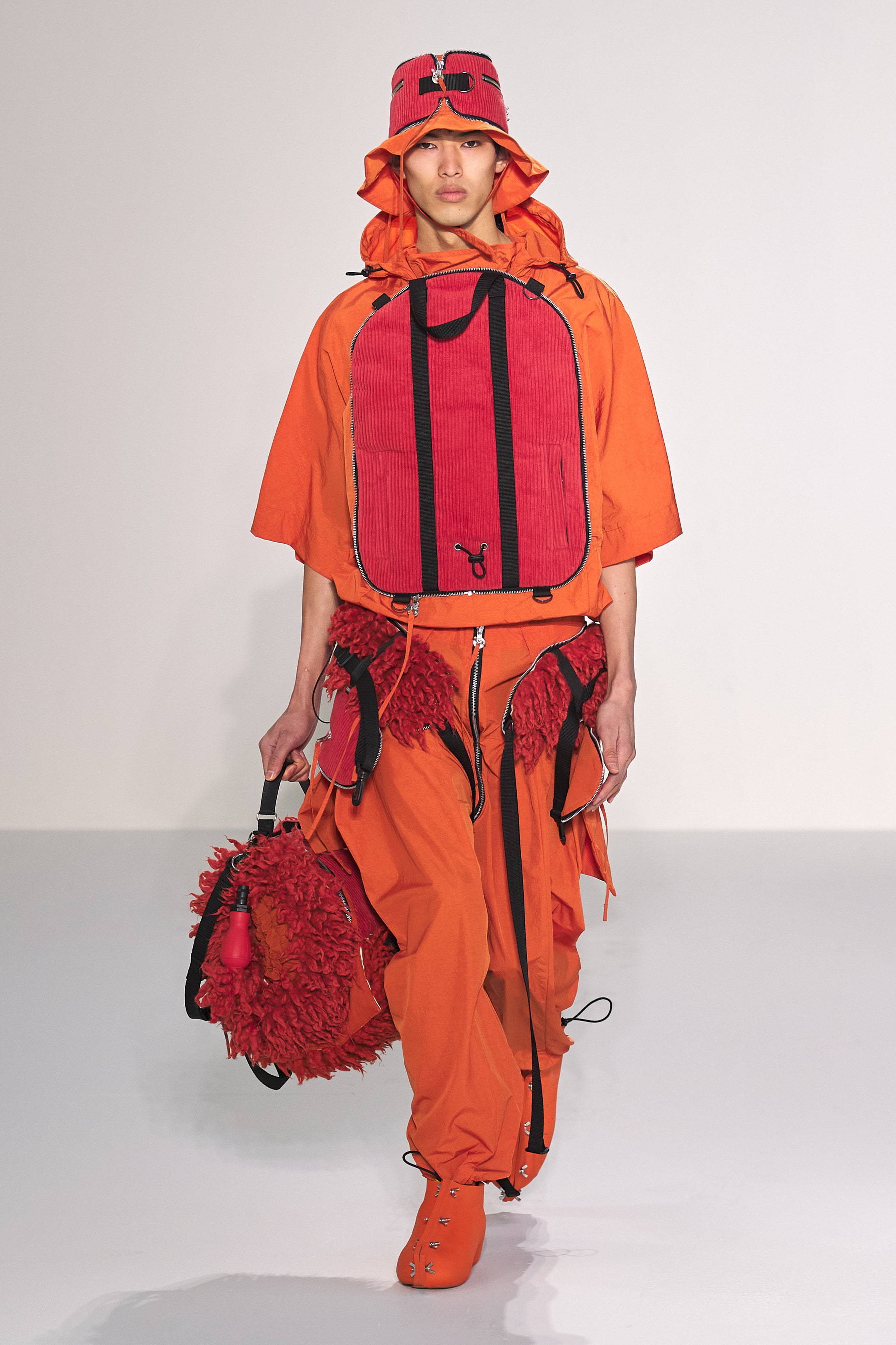 Craig Green 2022 秋冬系列探究了Craig對這些詞彙的含義:身體、封鎖的幽閉恐懼症,以及服裝中表現出來的內在感覺和外表間奇怪的心理摩擦。 憑藉著系列中的造型獨特的充氣服飾、毛海材質等多種紋理的運用,功能性設計和配飾的呈現都讓人沉浸其中。