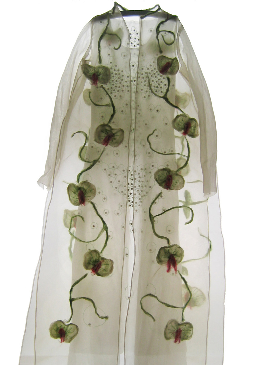 藝術家兼設計師 Beatrice Oettinger 在她獨特、浪漫的設計中運用不尋常的材料和織物融為一體。將花瓣、種子縫進輕薄半透的布料中展現植物的型態,彷彿植物生長於其中,一系列運用頭髮、植物製成的單品,透過觸覺、氣味和視覺的影響下巧妙地操縱我們的感官,將身體與自然聯繫起來。 #傳遞知識的副料大學