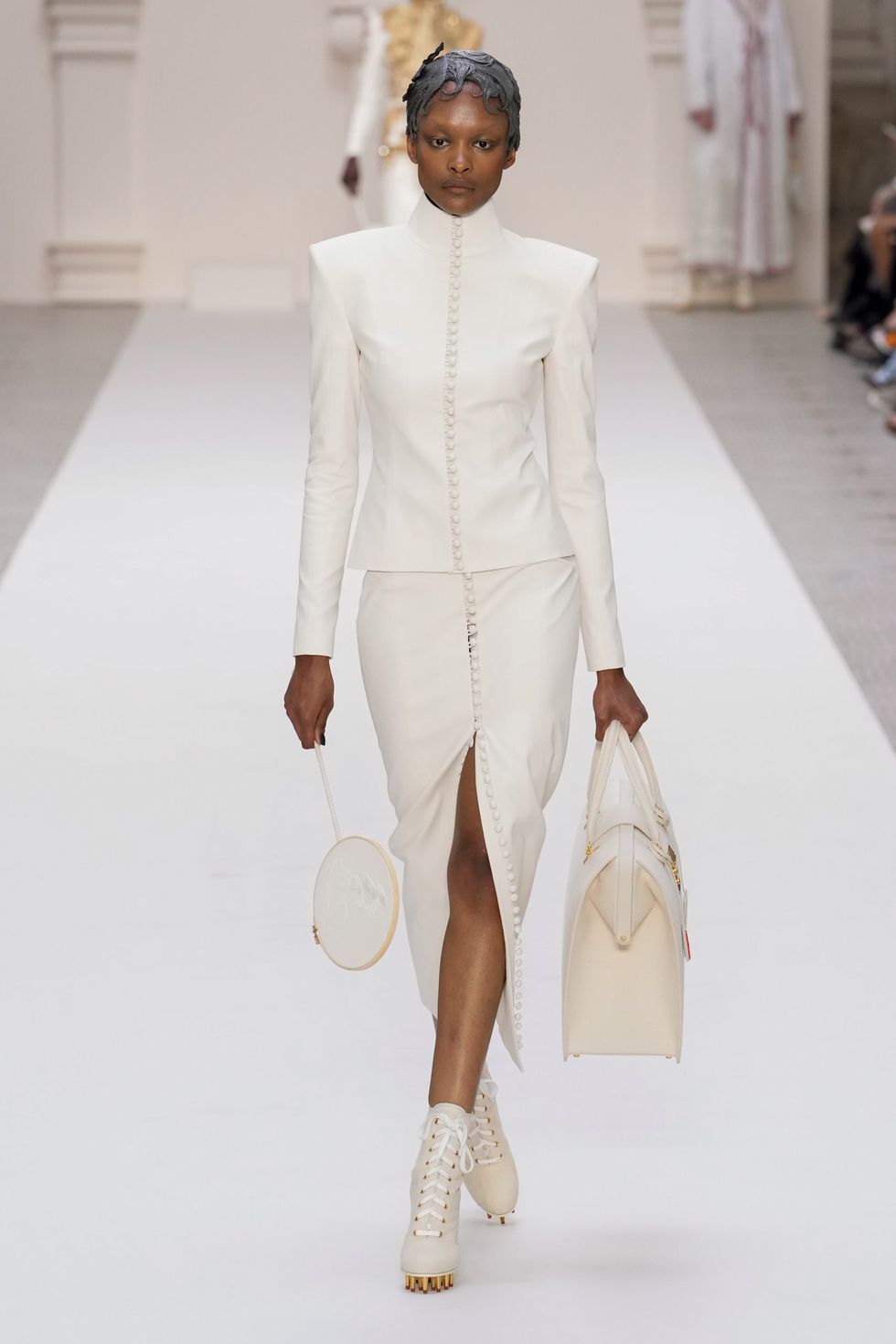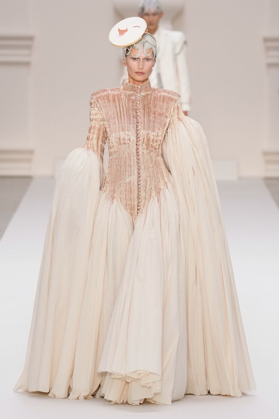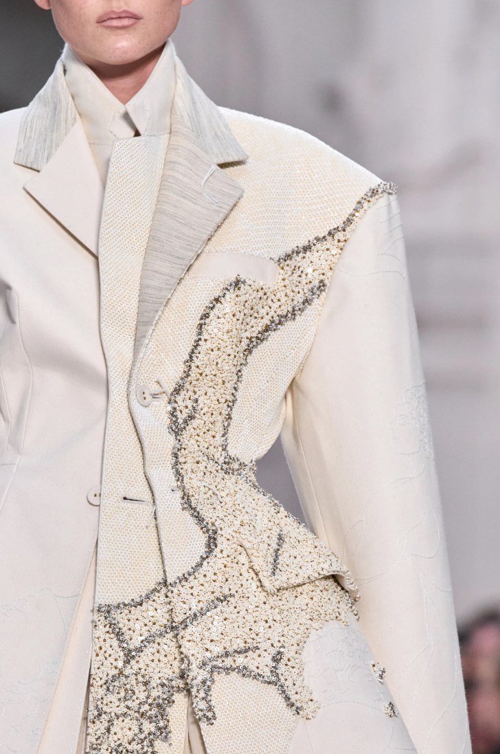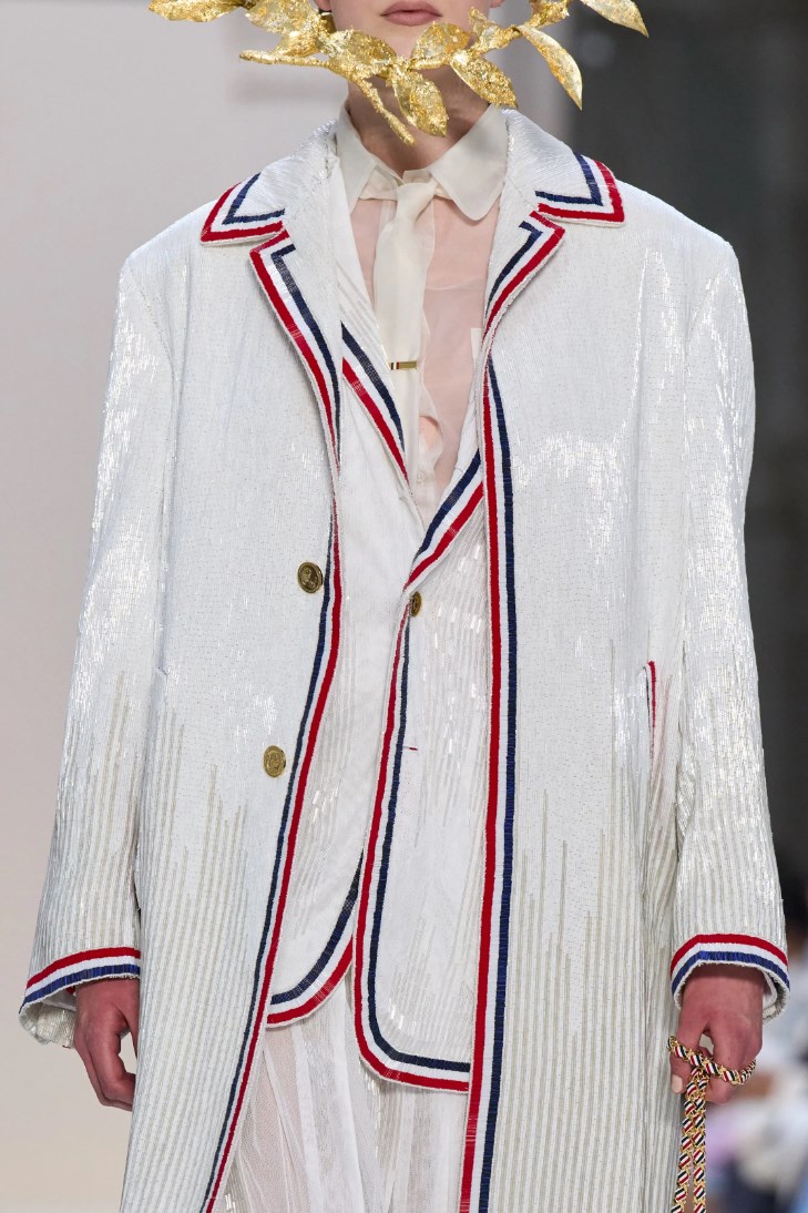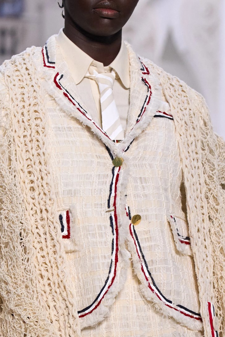 Thom Browne 2024 秋冬高訂系列使用各種不同重量的白色棉布精心製作而成。 從輕薄的層疊編織到厚重的解構剪裁,設計師運用巧妙的手法和工藝技術,呈現出一場工藝與創新結合的嶄新視覺饗宴✨